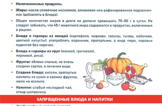 Ограничение в потреблении соли и жидкости, а также продуктов, содержащих холестерин и способствующих образованию газов, является важным аспектом. Следует также избегать продуктов, которые могут возбуждать сердечно-сосудистую и нервную системы. В рационе не должно быть ингредиентов, раздражающих печень и почки, при этом он должен быть насыщен витаминами, магнием и калием.